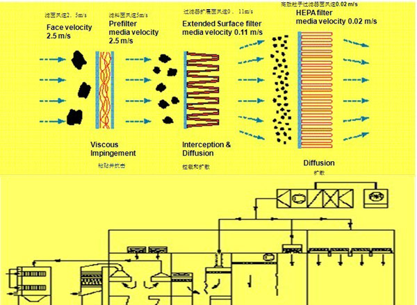 空調(diào)送風(fēng)系統(tǒng)通過一定的流速將灰塵送到過濾系統(tǒng)當中,初級過濾器將5um以上大顆粒灰塵留在過濾表 面,中效過濾器將1um-5um顆粒抓取,高效過濾器將0.3um-0.5um以上灰塵顆粒過濾,從而保證無塵車間等級!