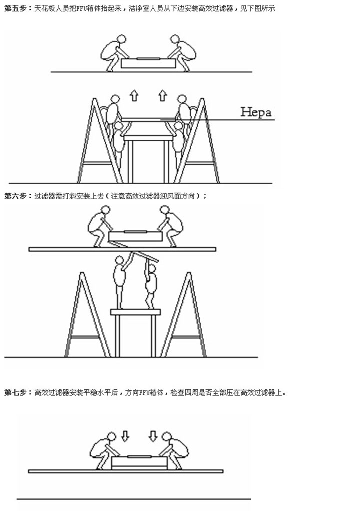 4、吊頂天花板上的安裝人員把FFU箱體抬起來,地面安裝人員從下邊安裝高效過濾器。